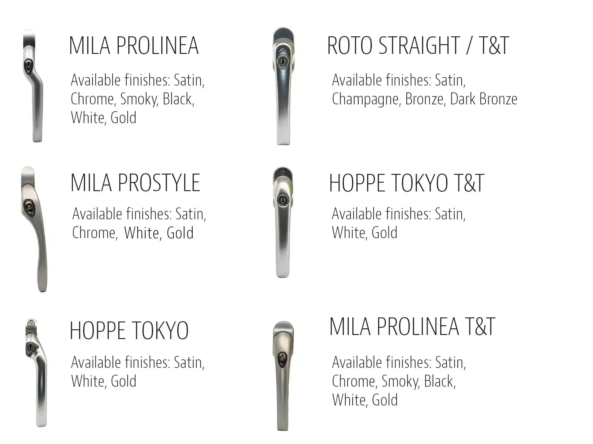 Window and door handles typically come in a range of choices. Find the perfect style to complement your project, from modern to traditional, in our brochures. Discuss with our sales and order processing teams during your project specification to see all your options.