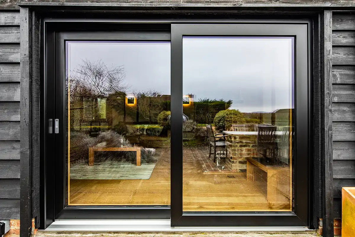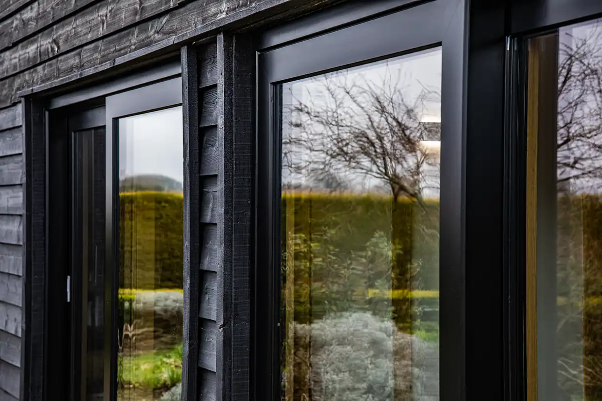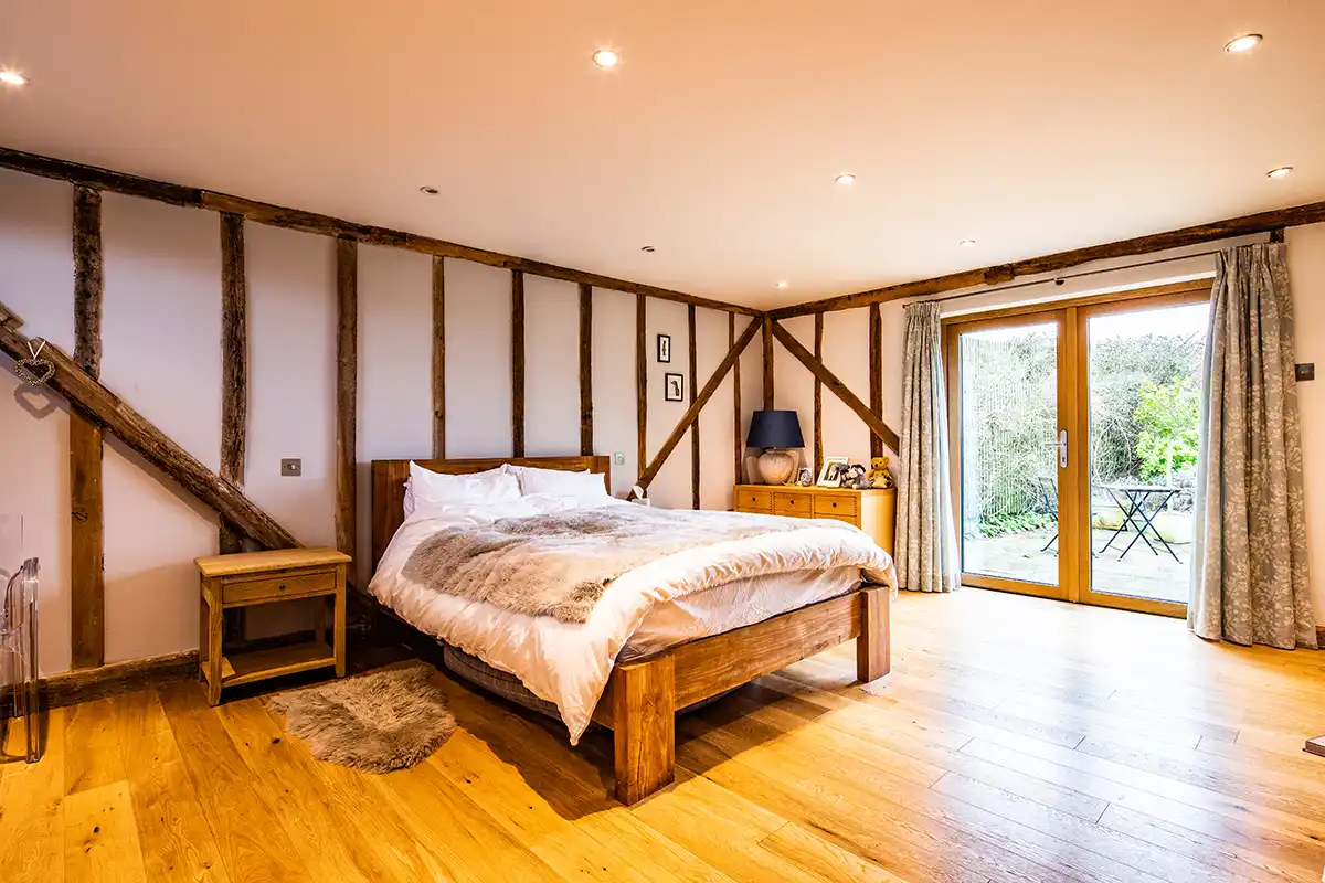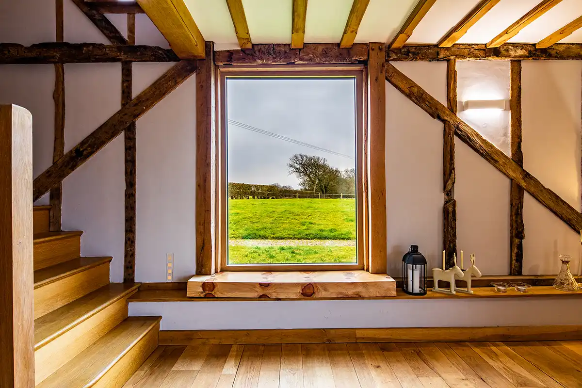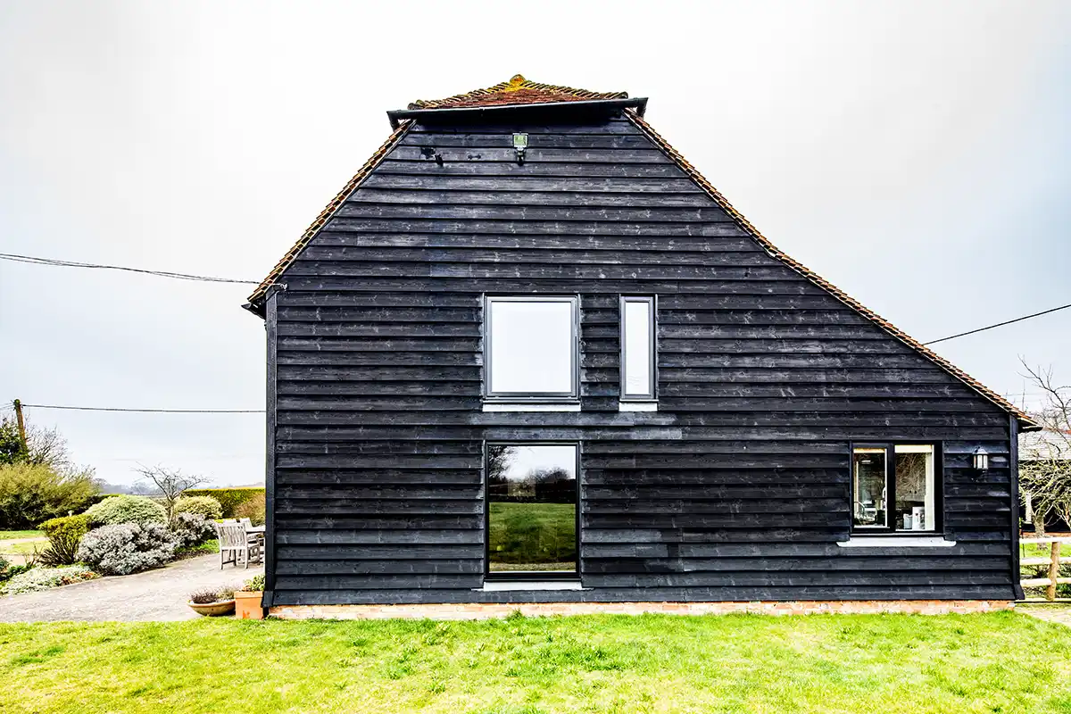 The black external window colour meeting the black cladding creates a striking look, whilst internally the old oak beams and the engineered oak window and door frames creates a living space with a truly unique feel.