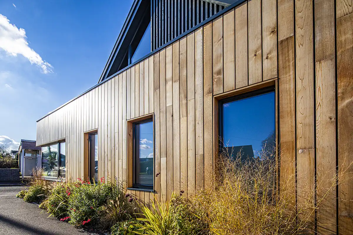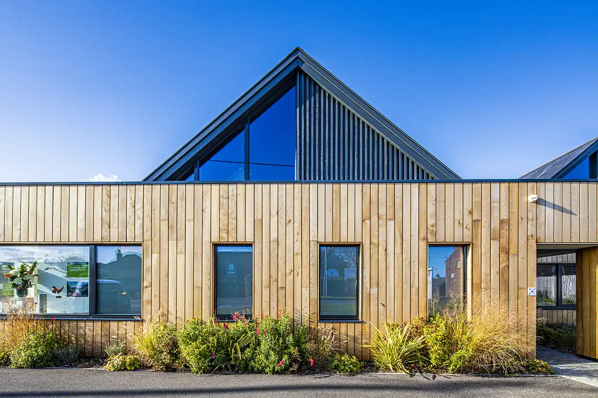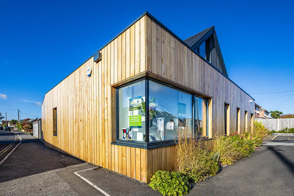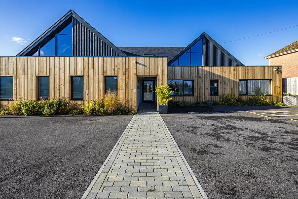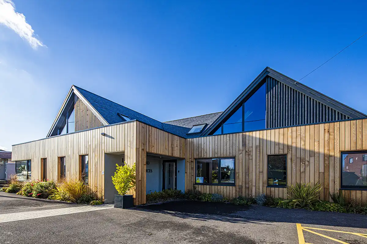 Located in Dorset this unique project for Lesley Shand Funeral Directors, designed by DMWA architects, incorporated angled glazing and minimal corner to corner glass. The interior finish gives a light but natural look as the brief was for a modern but sympathetic feel.