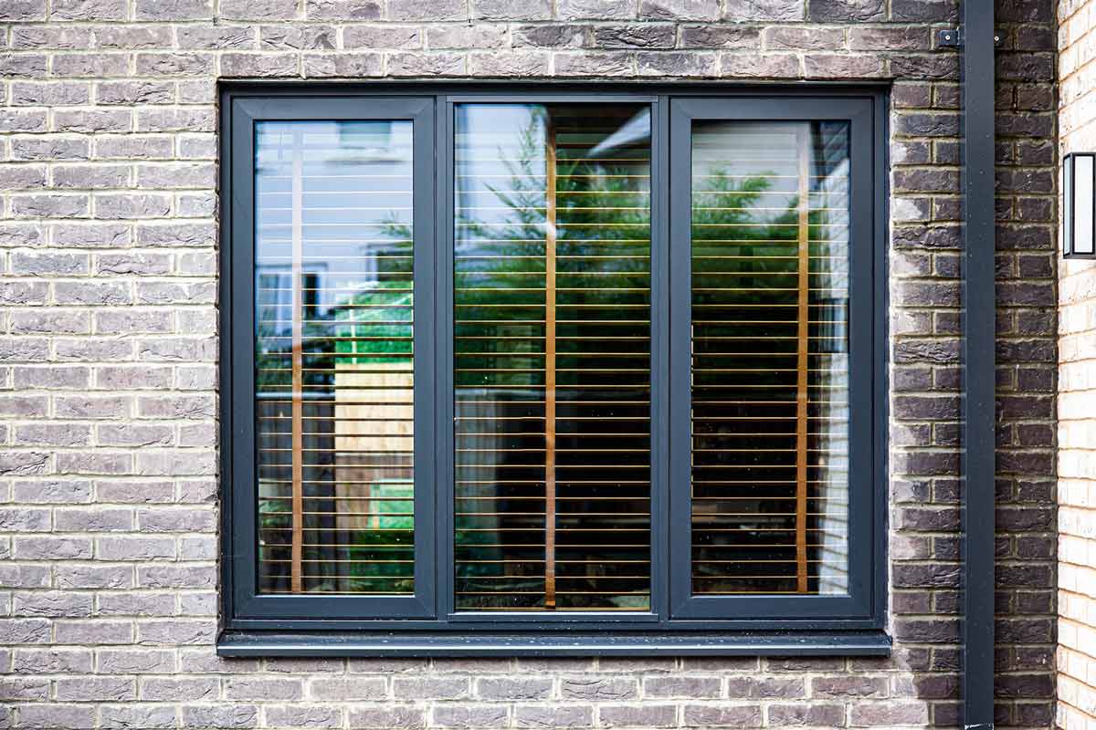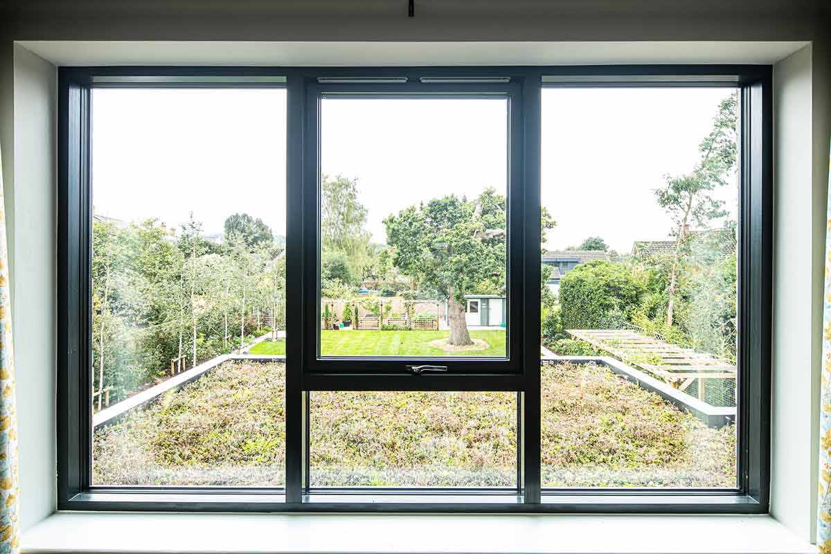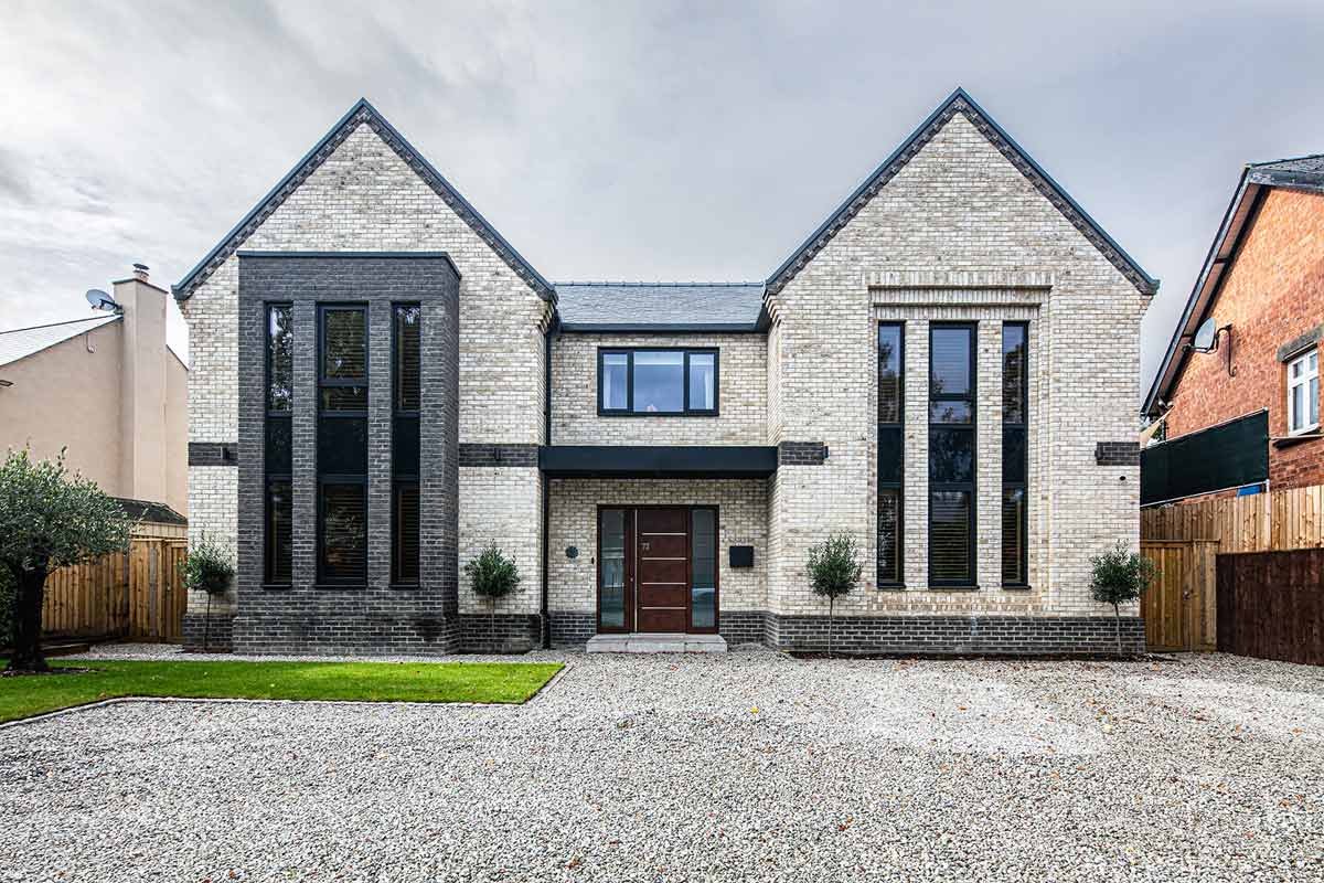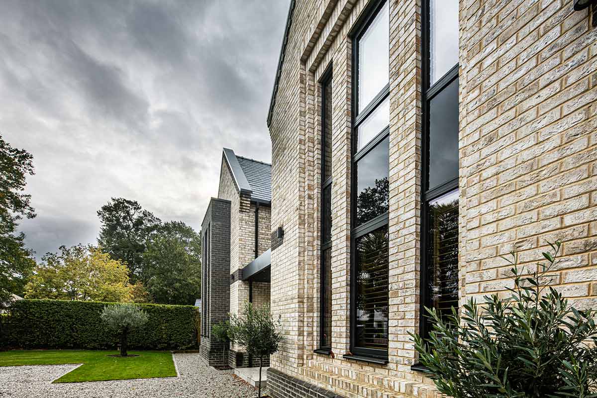 Creative anthracite grey brick detailing and depth play across the facades cleverly interrupt the classical symmetry of the home's twin gables. Bold, double height glass columns featuring our P31A windows with back-painted glass create an impressive entrance to this innovative design.