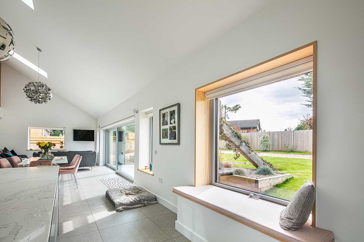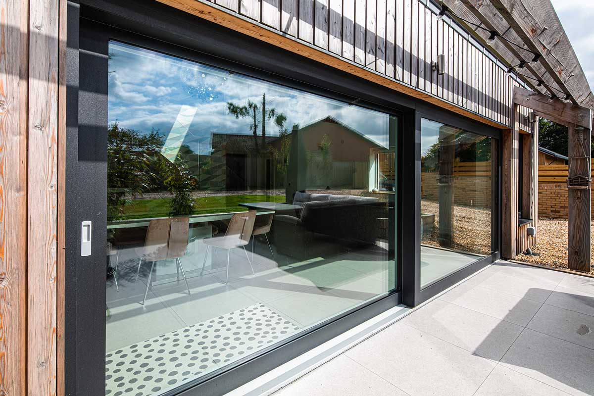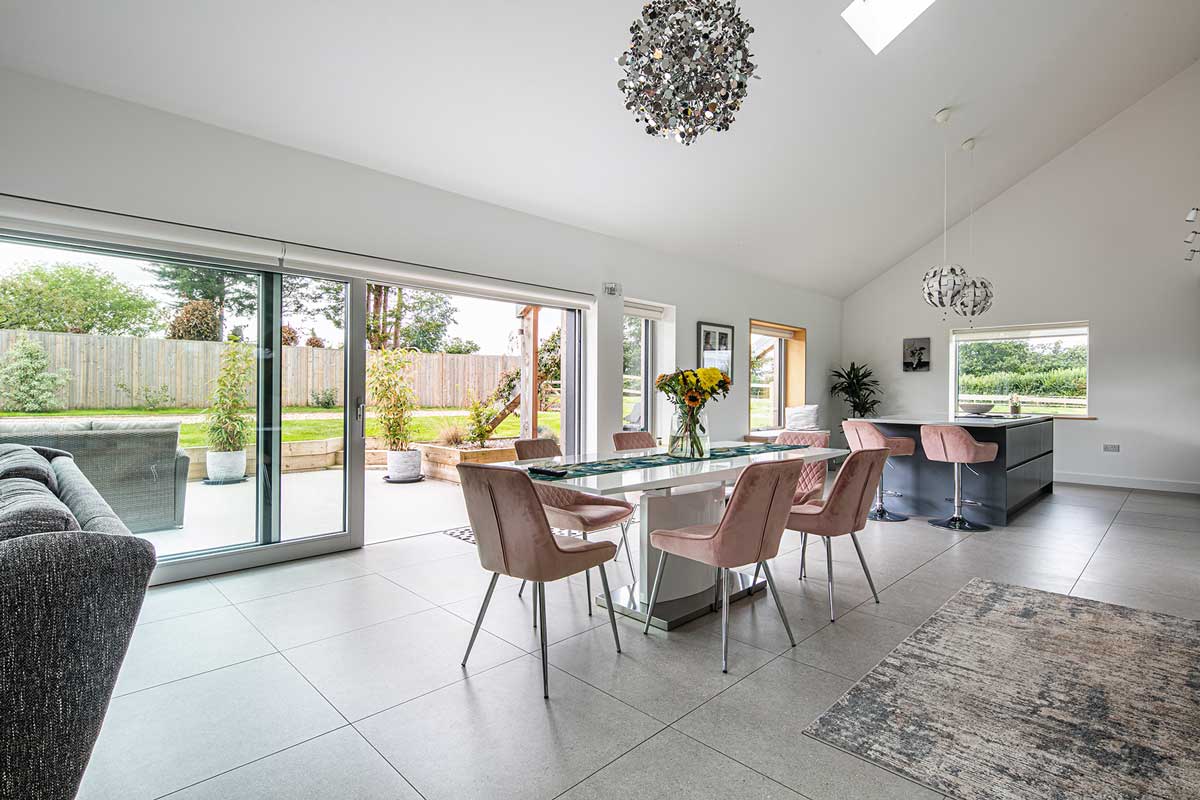 This three-bedroom timber-frame new build was designed by MBC Timber Frames to meet all the needs of a family home with a compact and cleverly designed footprint. Norrsken S316A Lift & Slide doors are a central feature, merging a beautiful outdoor entertaining space seamlessly into the kitchen-dining room.