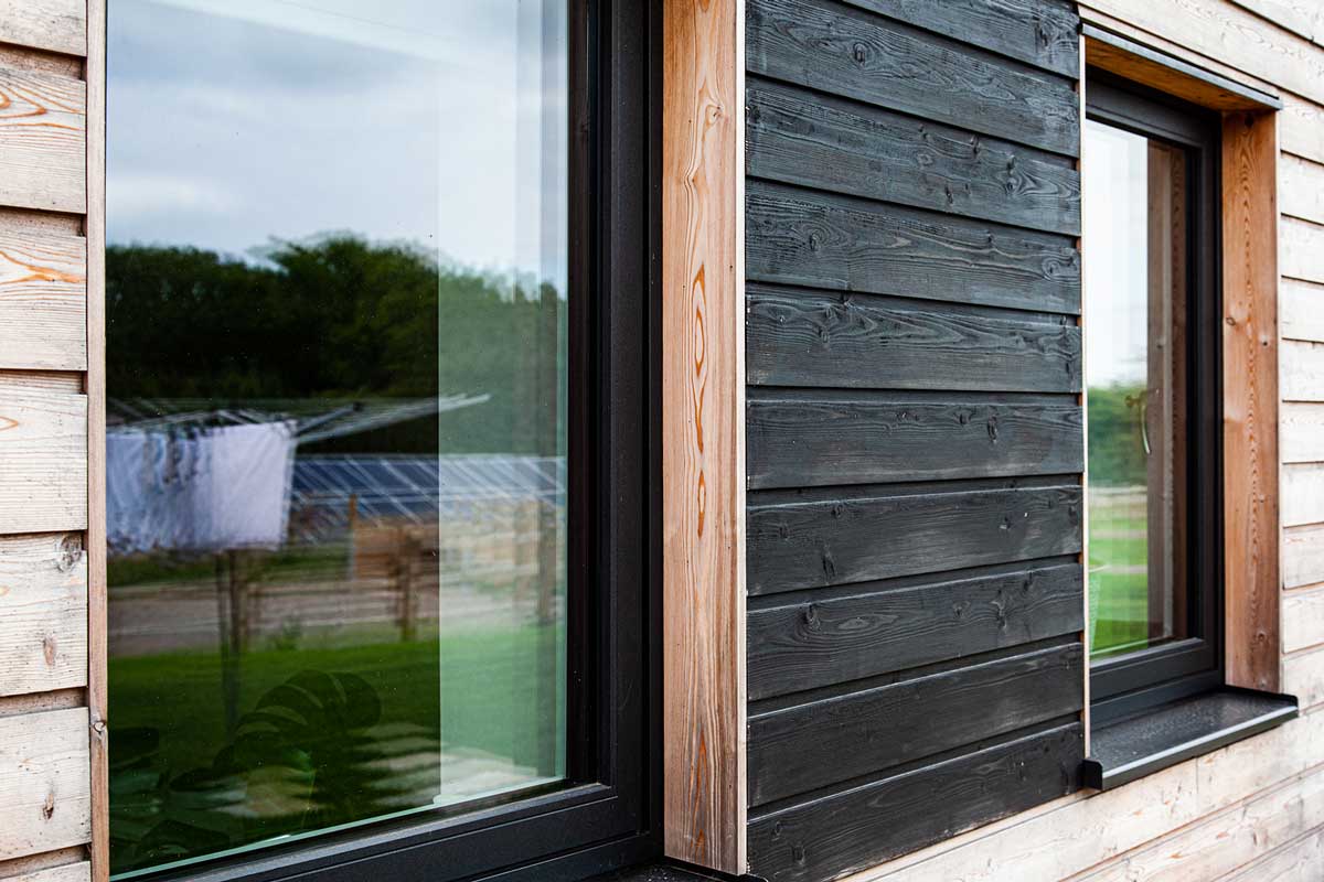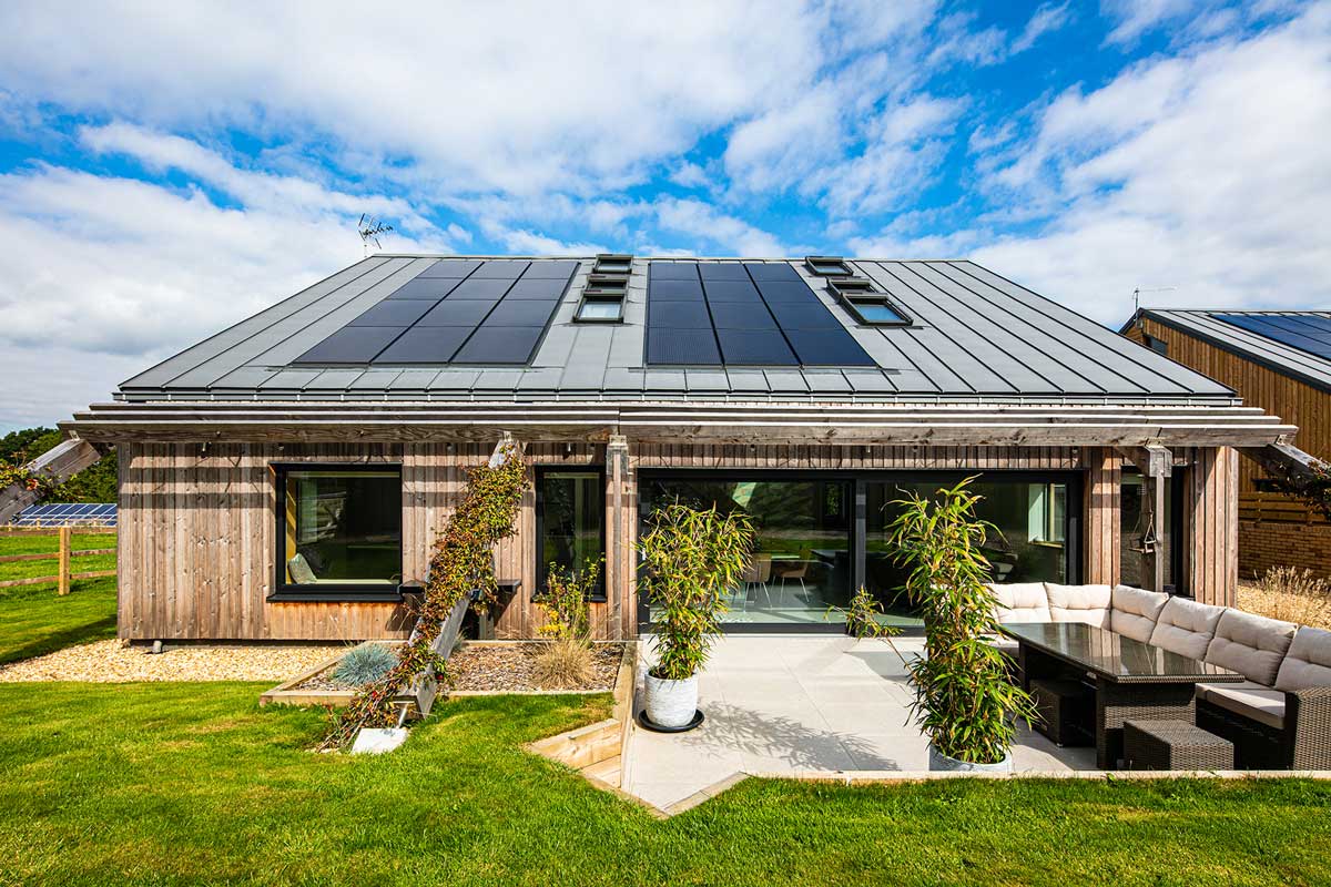 Wood features heavily throughout this project both structurally and decoratively. Timber cladding and gable structures form a clean two-tone palette with striking windows, doors, black cladding detail and photovoltaic roof tiles.