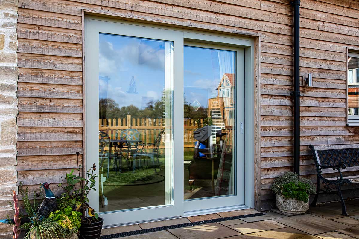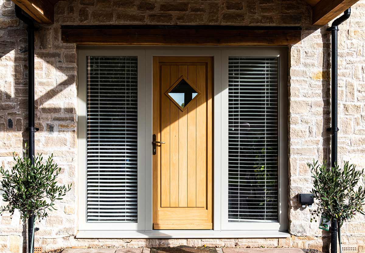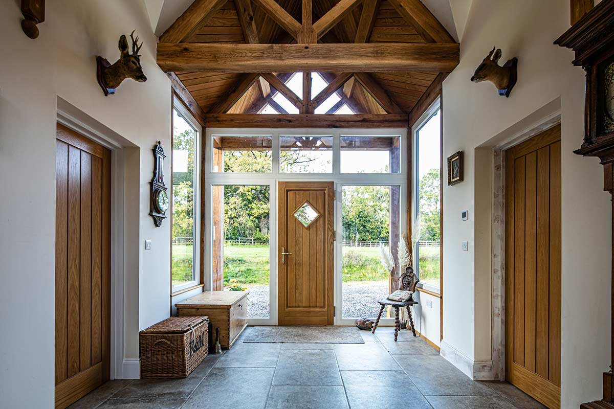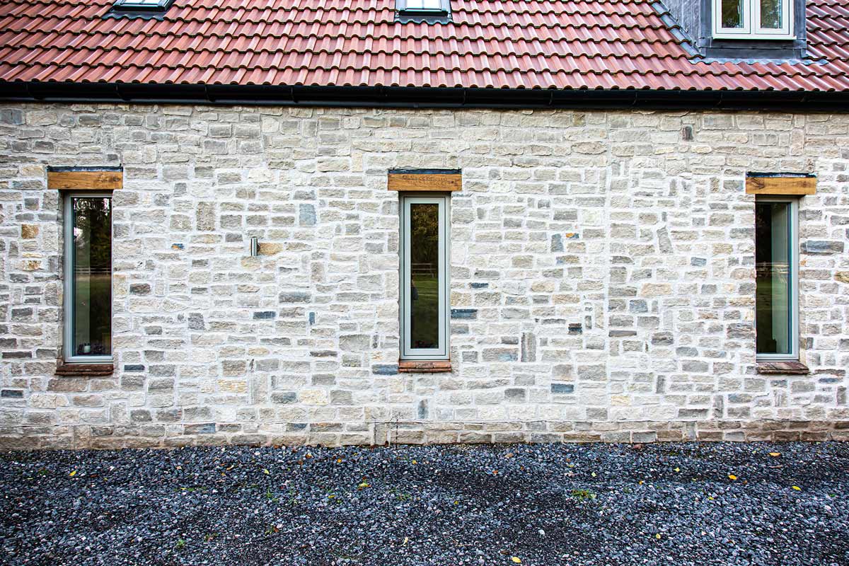 Externally, both timber cladding and traditional stonework obtained from local suppliers were used. Windows and doors finished in RAL 7032 Pebble Grey blend beautifully with these finishes, while oak entrance doors continue the warm wooden theme internally.