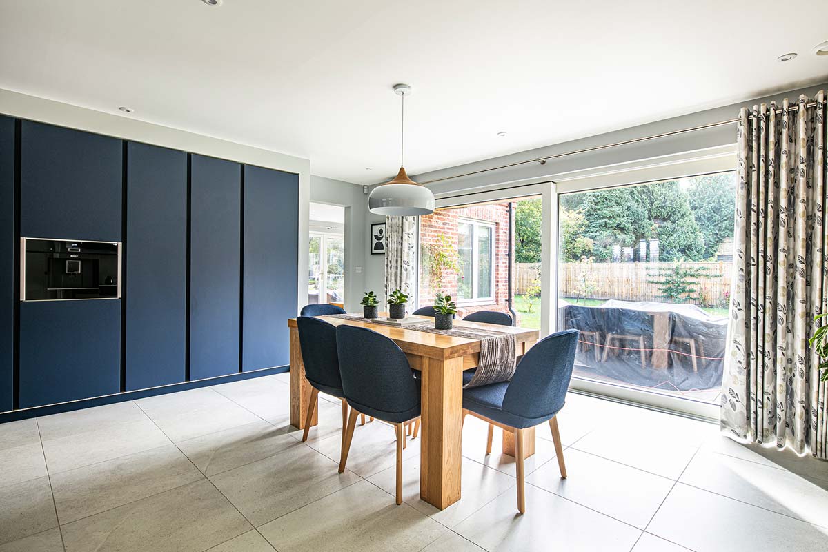 Insulated timber panel entrance doors in RAL 5011 Steel Blue make a bold but sophisticated contrast against classic brickwork, while double sets of S315A sliding doors bring symmetry to the rear elevation and open the living spaces up to plenty of natural light.