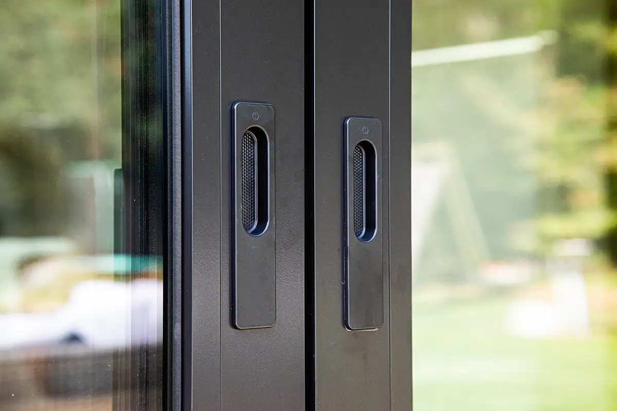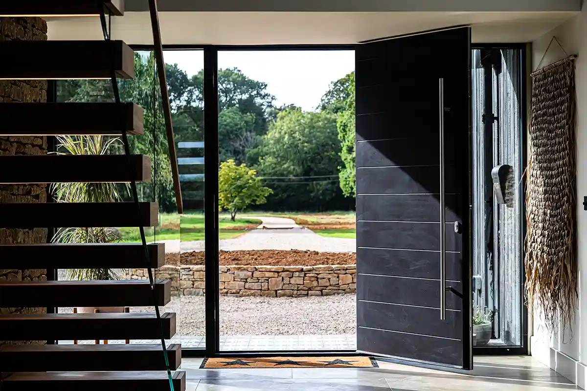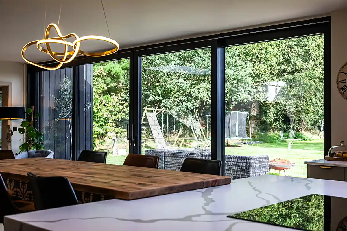 The strong look of the black alu-clad timber windows sits nicely with the natural materials inside and the combination of the insulated timber frame and triple glazed P31A windows give a lovely comfortable living environment. The large fixed glazing elements allow the stunning views to be enjoyed to the full.
