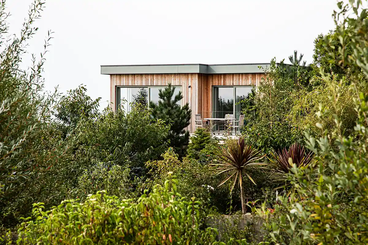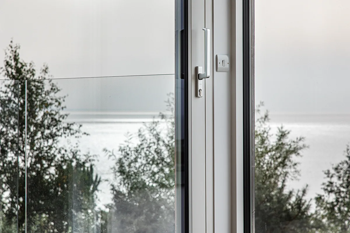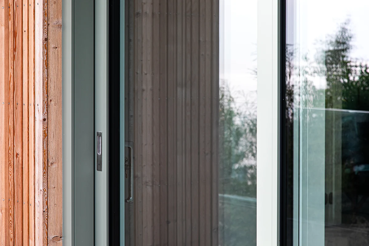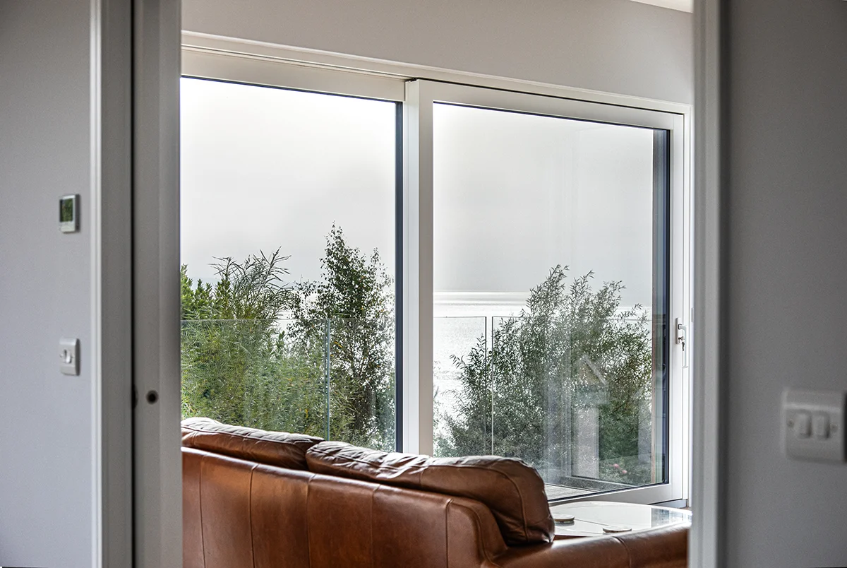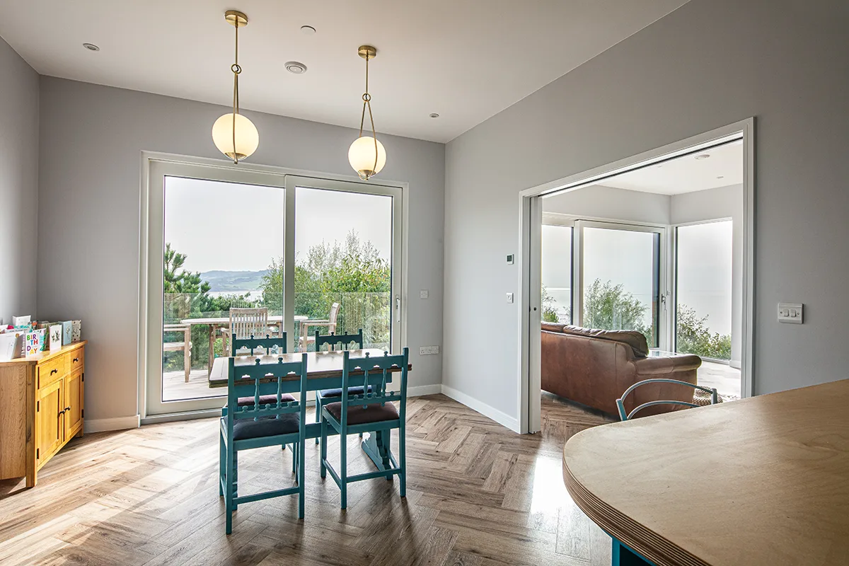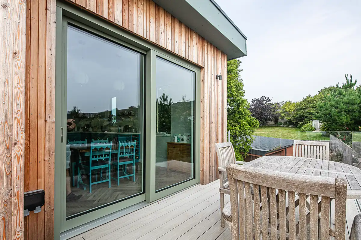 High performance glazing and a number of lift and slide doors allow lots of light in and keep energy costs down. The popular colour of RAL 7033 Cement Grey sits nicely with the external timber cladding and the high level balcony provides the perfect spot to enjoy the coastal views.