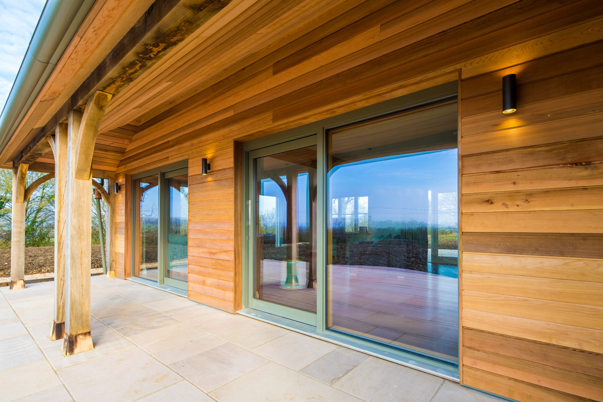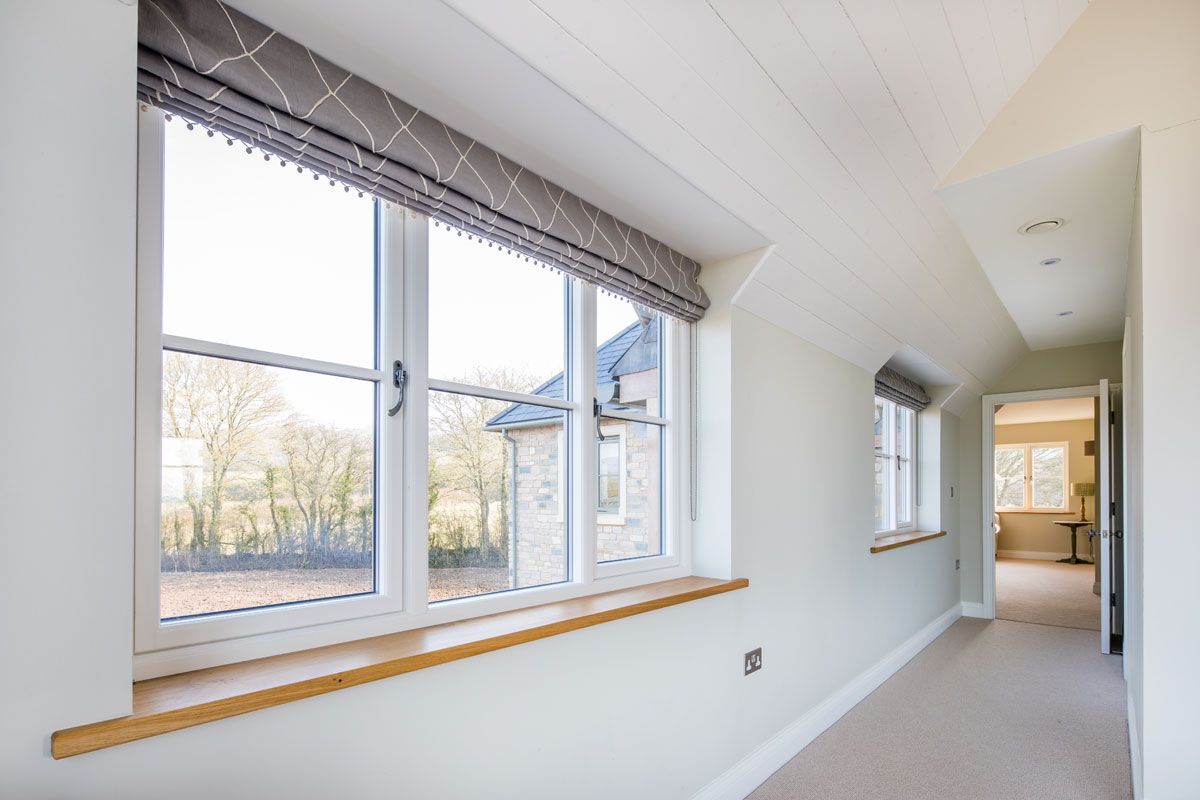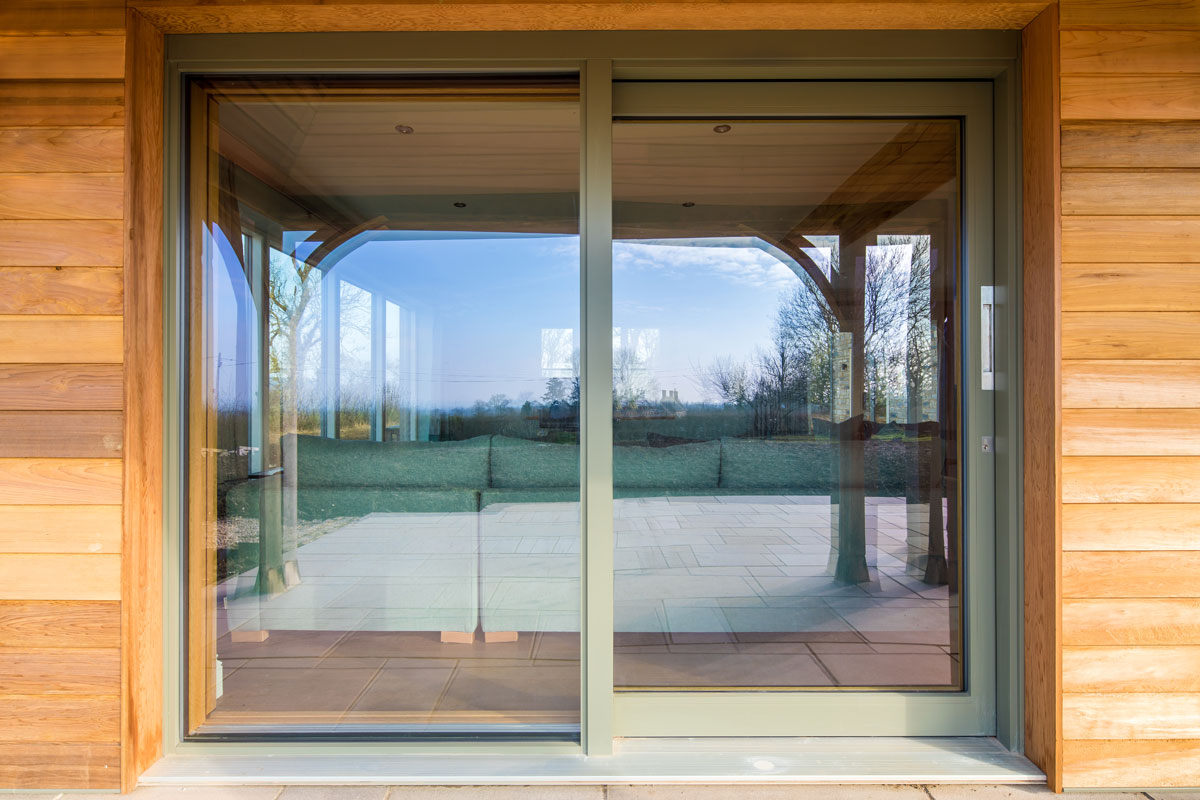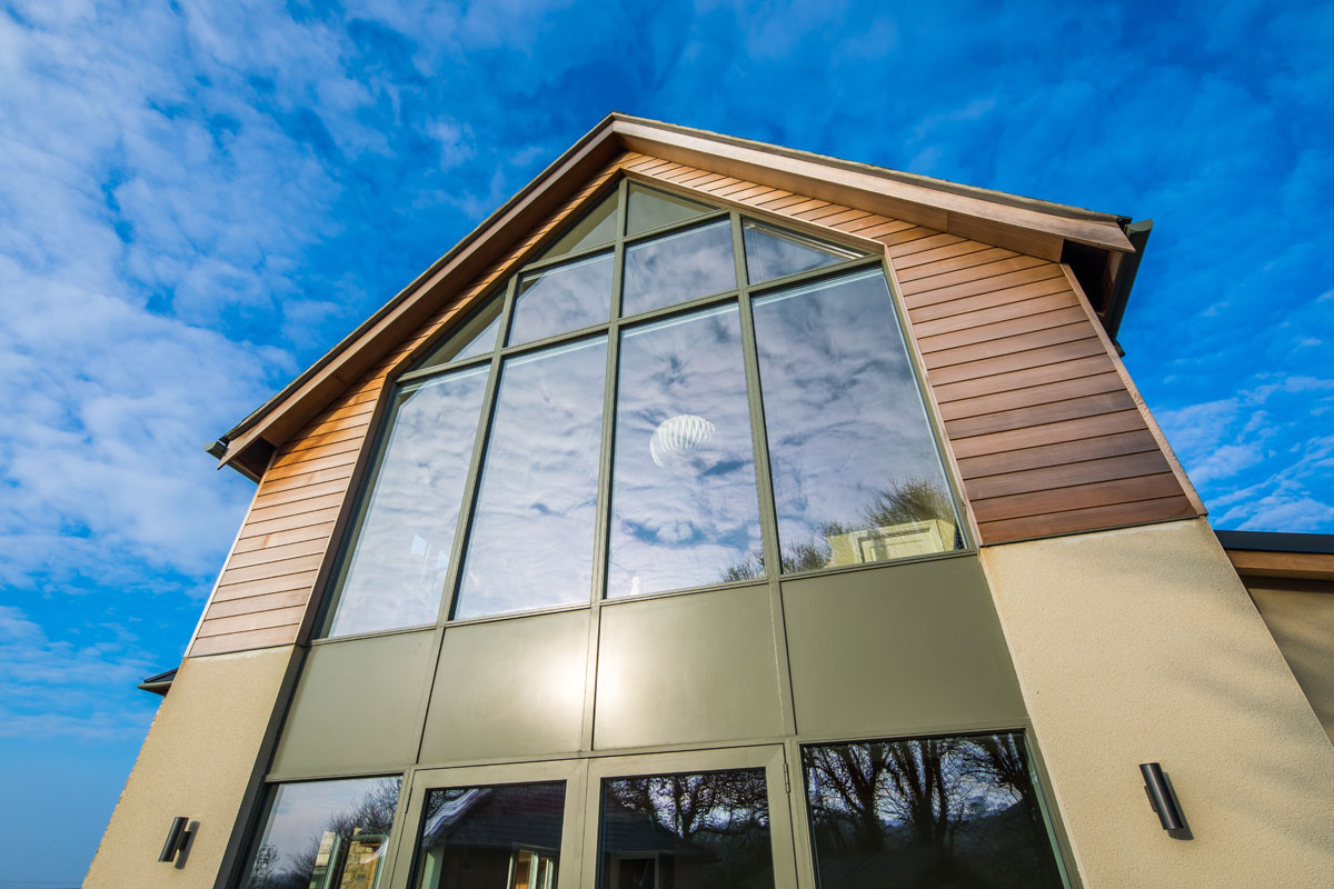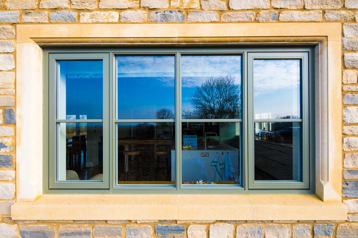 Aluminium clad casement windows are given a more traditional feel with the addition of horizontal glazing bars and blend beautifully with the moss grey powder-coated window frame claddings. These in turn look superb against the mixture of stone, render and timber claddings used throughout the external of the building.