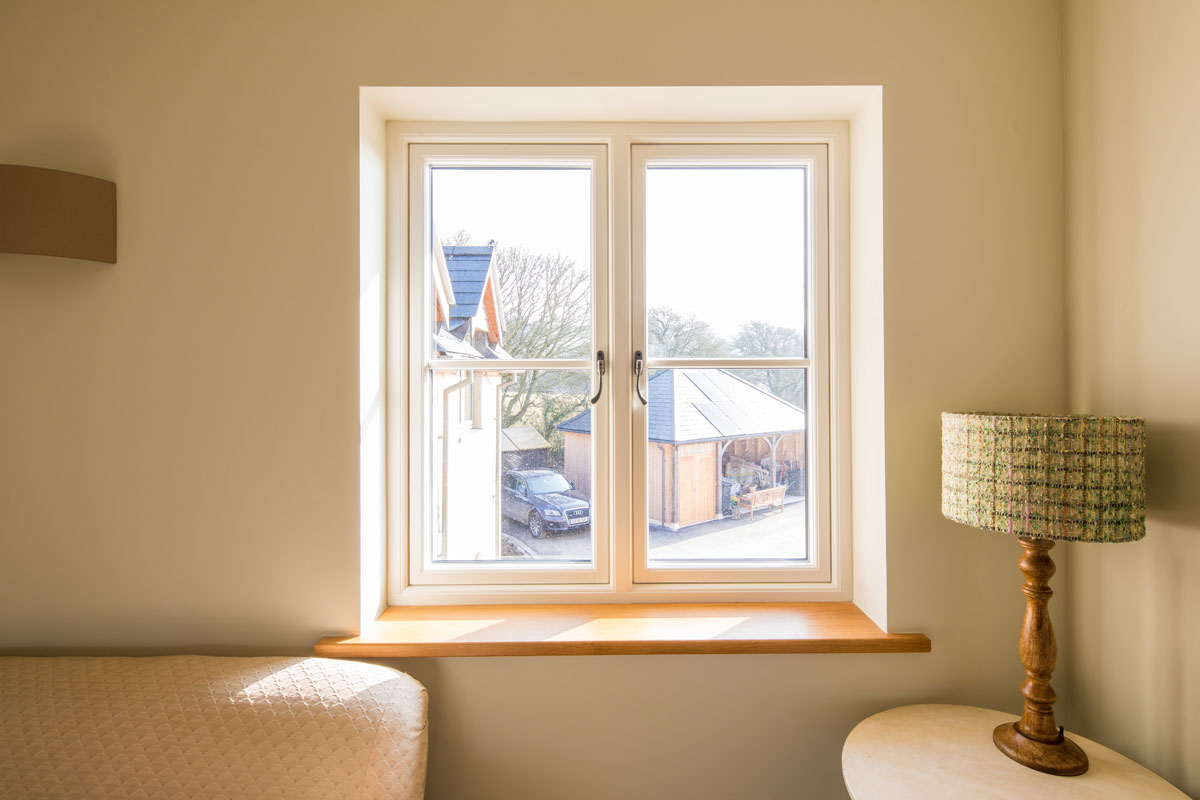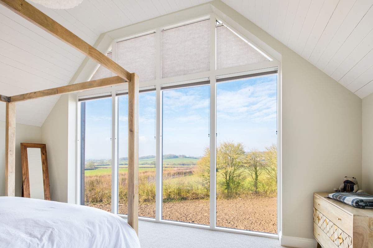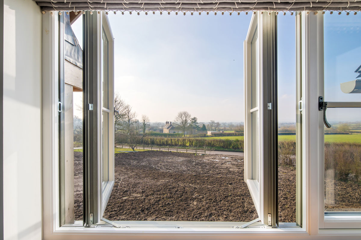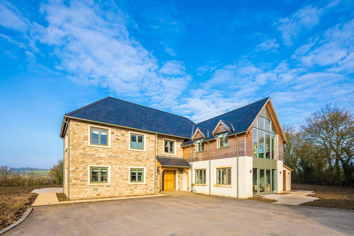Aluminium clad casement windows are given a more traditional feel with the addition of horizontal glazing bars and blend beautifully with the moss grey powder-coated window frame claddings. These in turn look superb against the mixture of stone, render and timber claddings used throughout the external of the building.