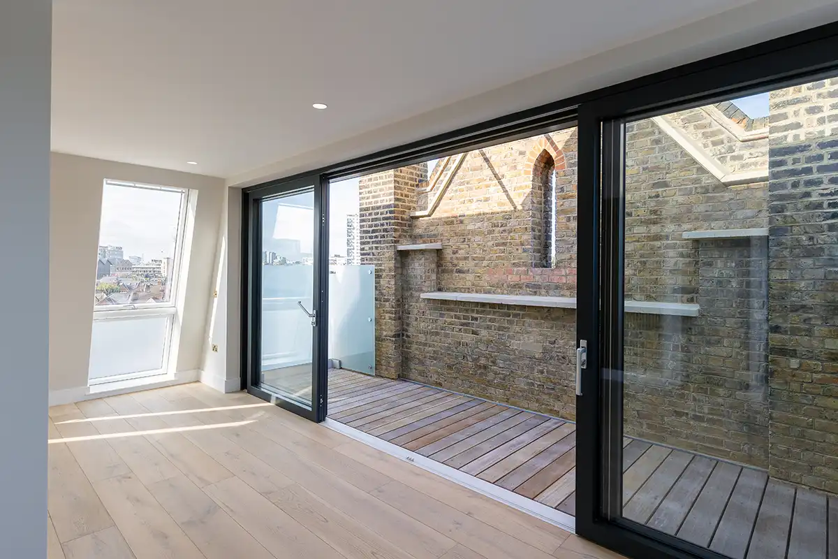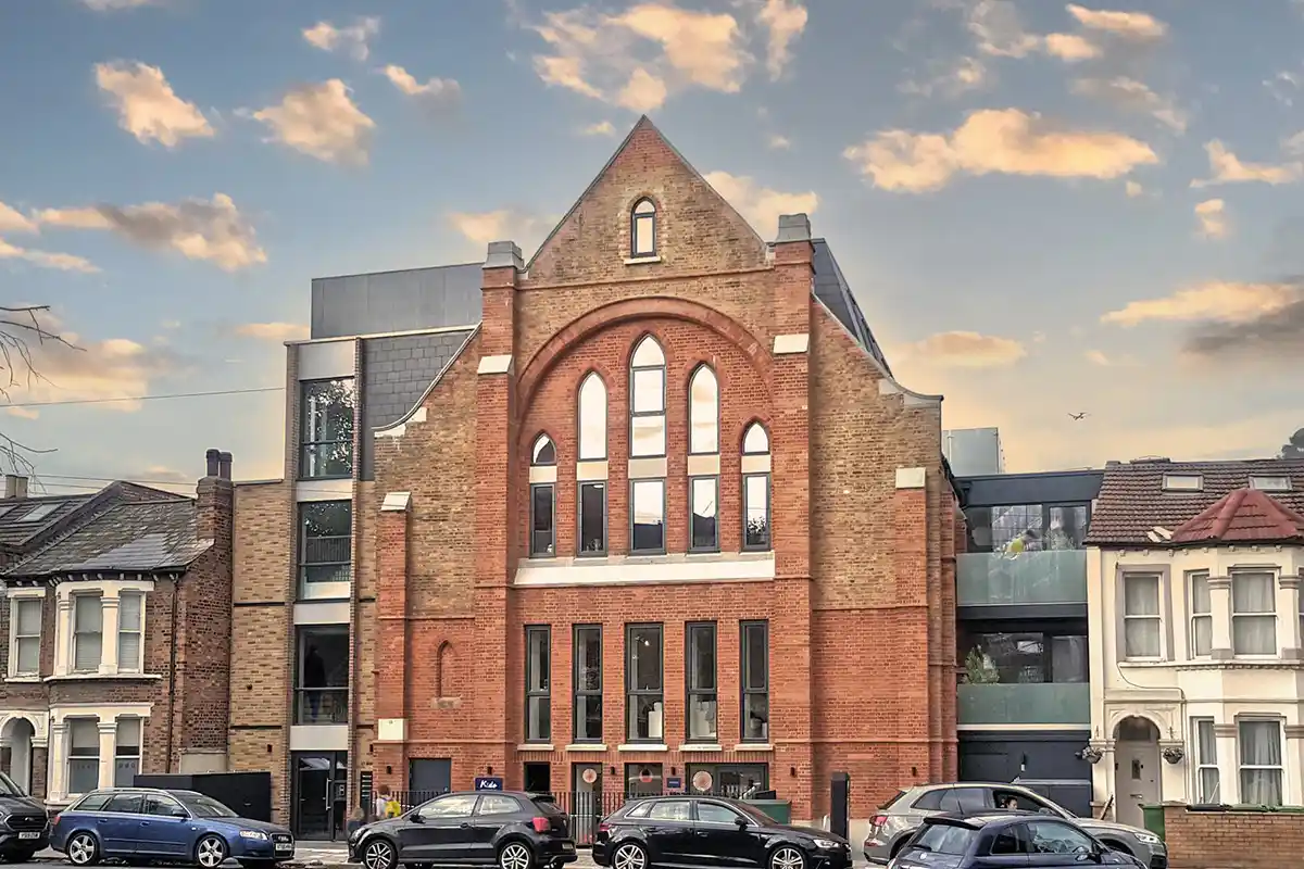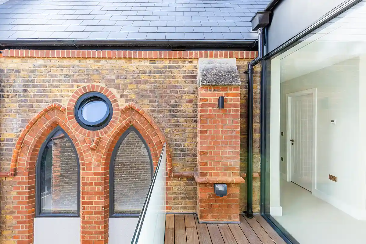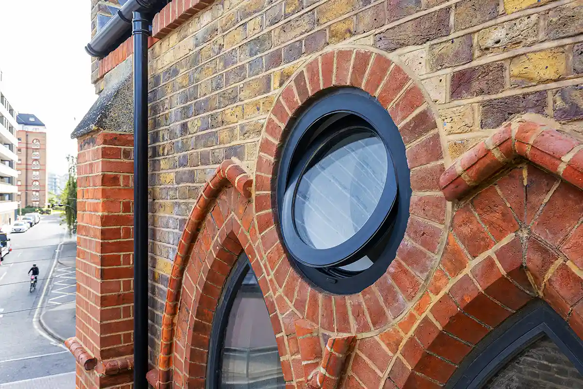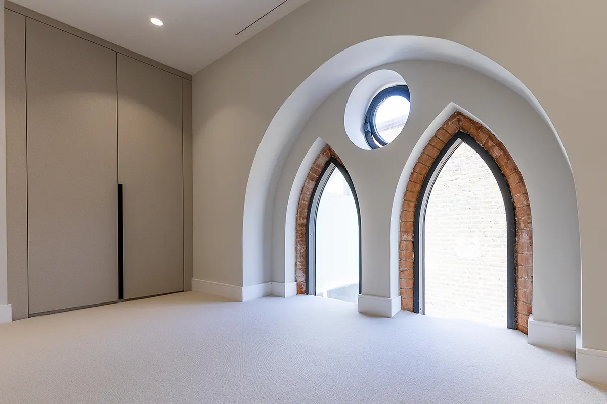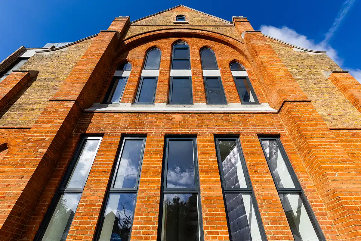 The project features 47 window and door units in various configurations, with both outward-opening and top-swing designs. The careful restoration preserved the building's character, including its distinctive Gothic arches, while implementing sustainable design principles that significantly reduced the project's carbon footprint through building retention rather than complete demolition.