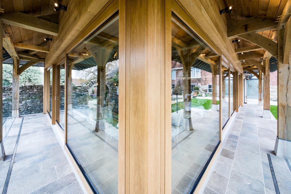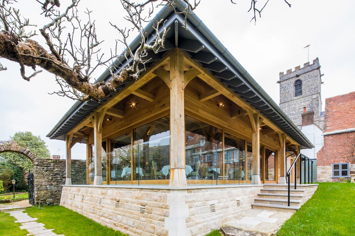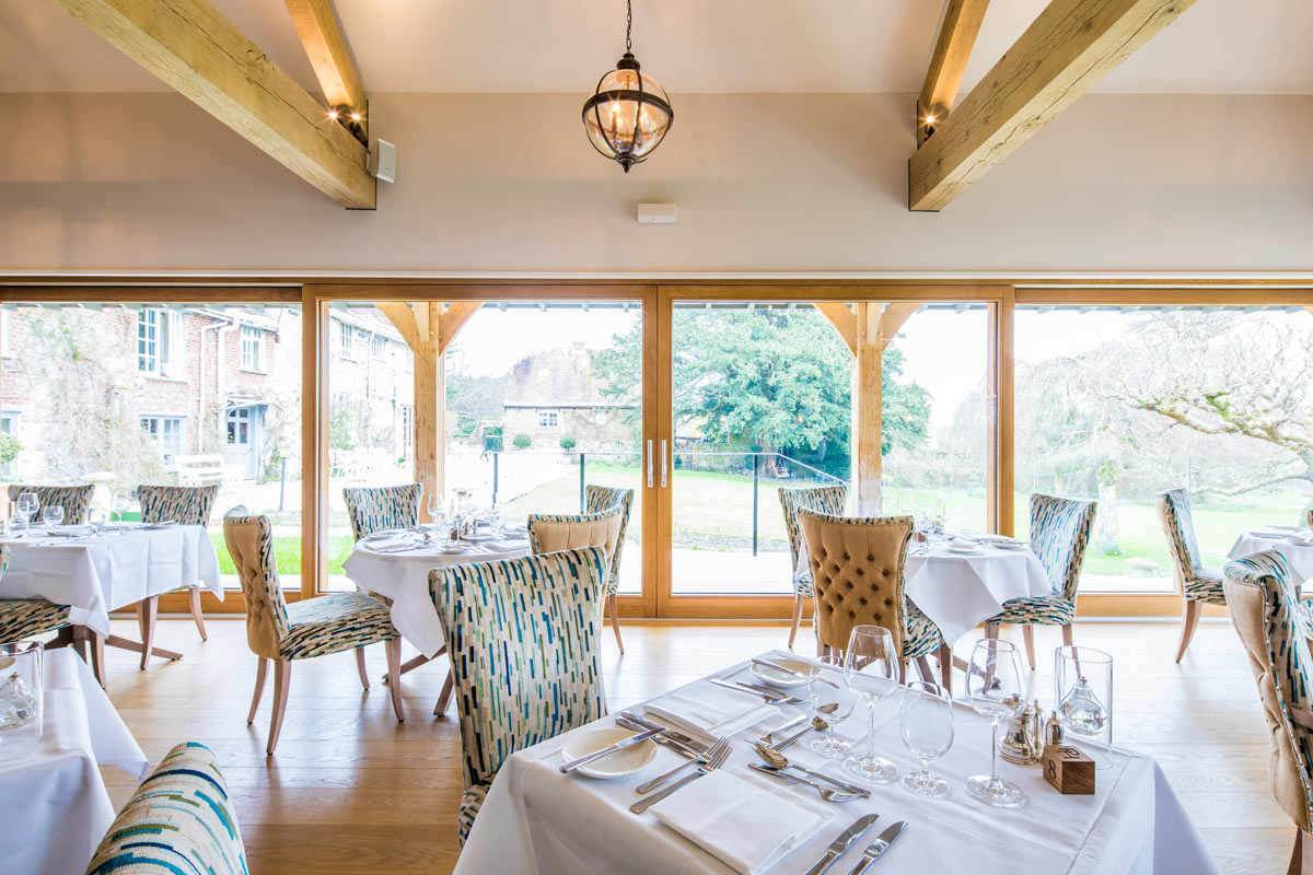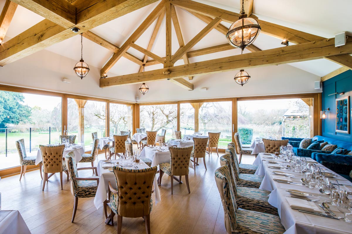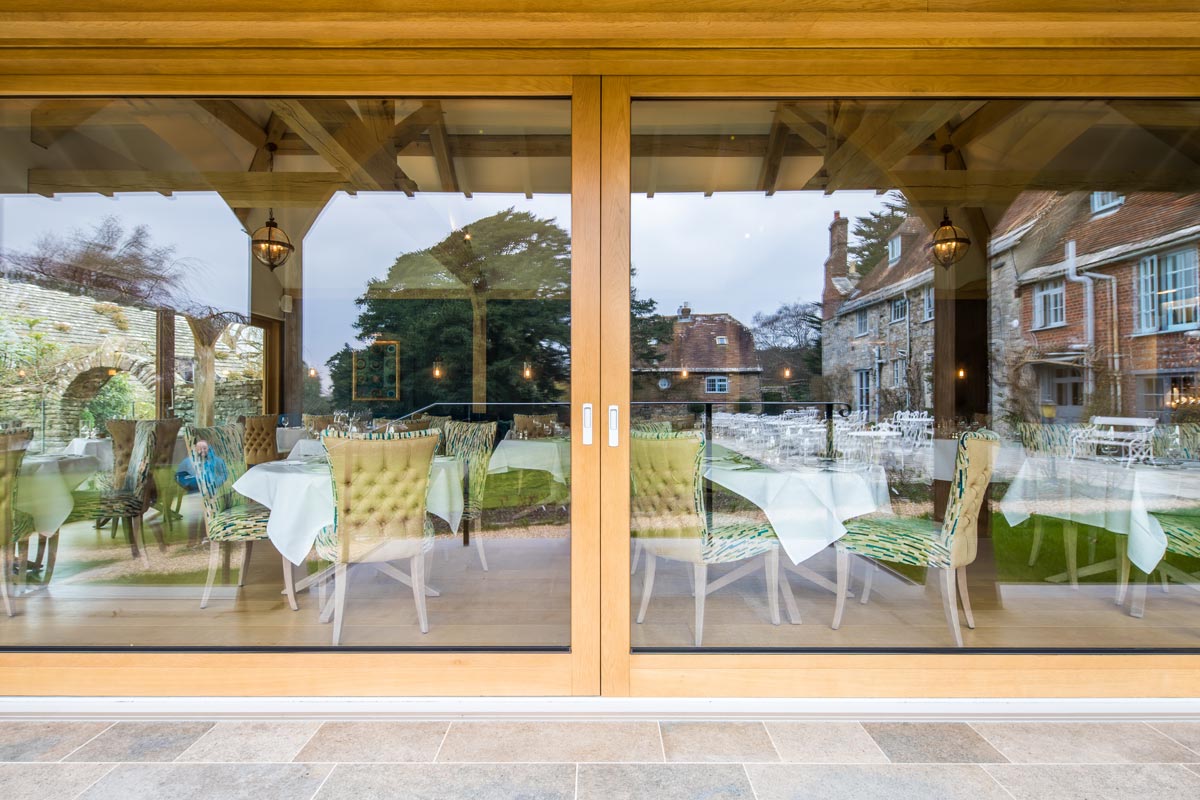 The Priory in Wareham, Dorset is a beautiful, traditional hotel and restaurant situated right on the river Frome. An all new dining extension and kitchen was built in 2017 by Greendale Construction, and the room allowed for very large oak lift and slide doors.