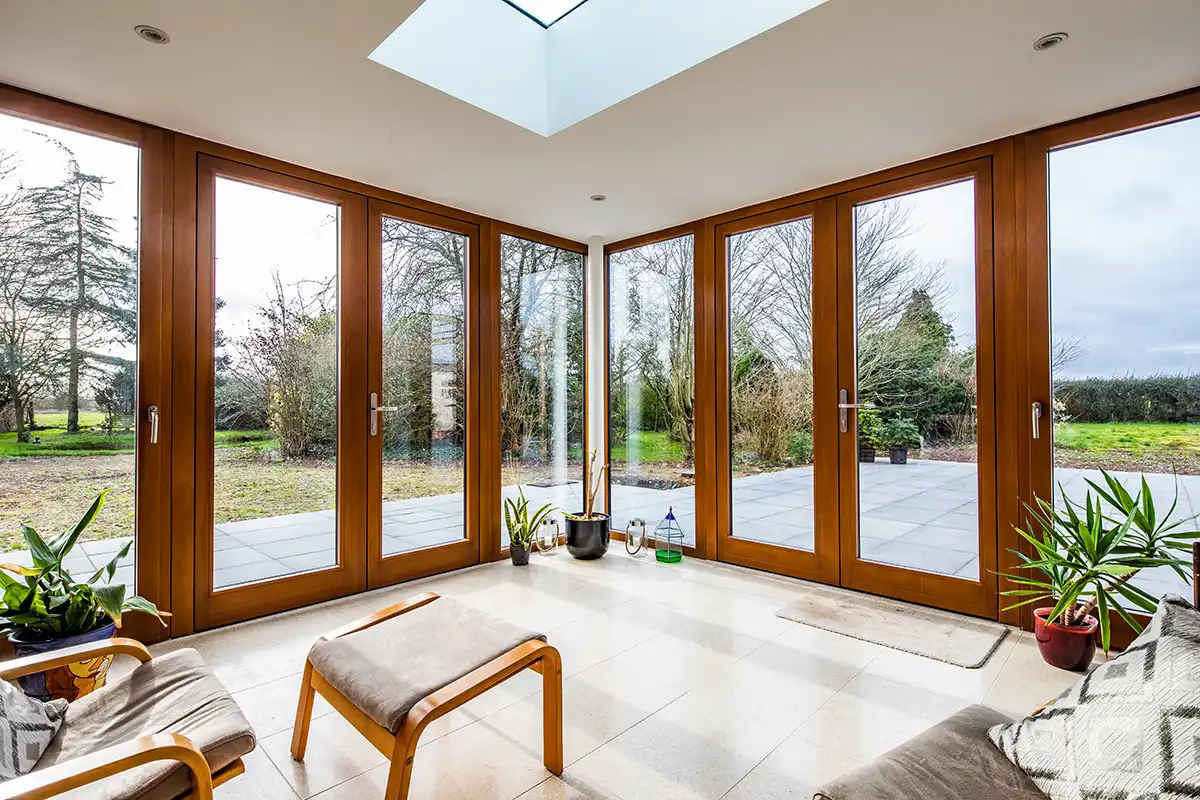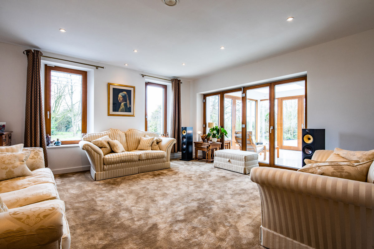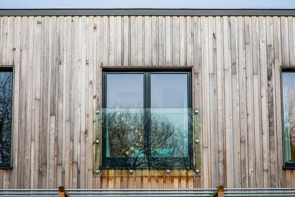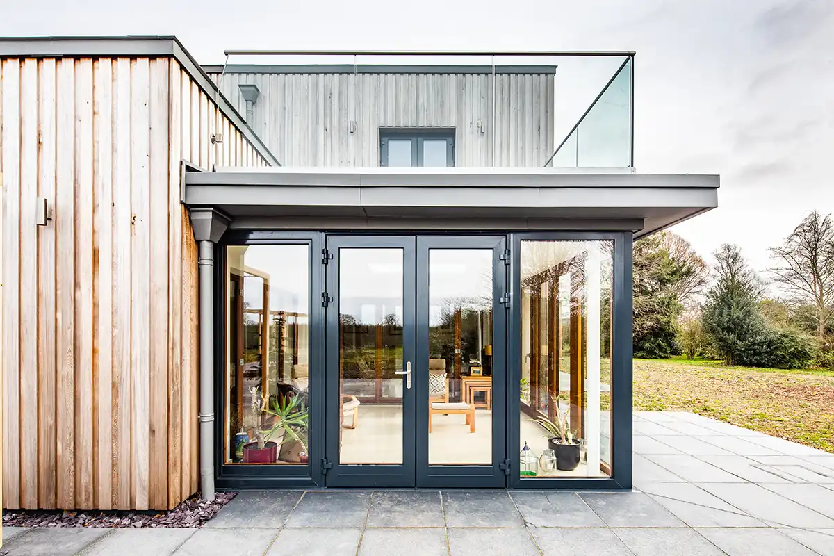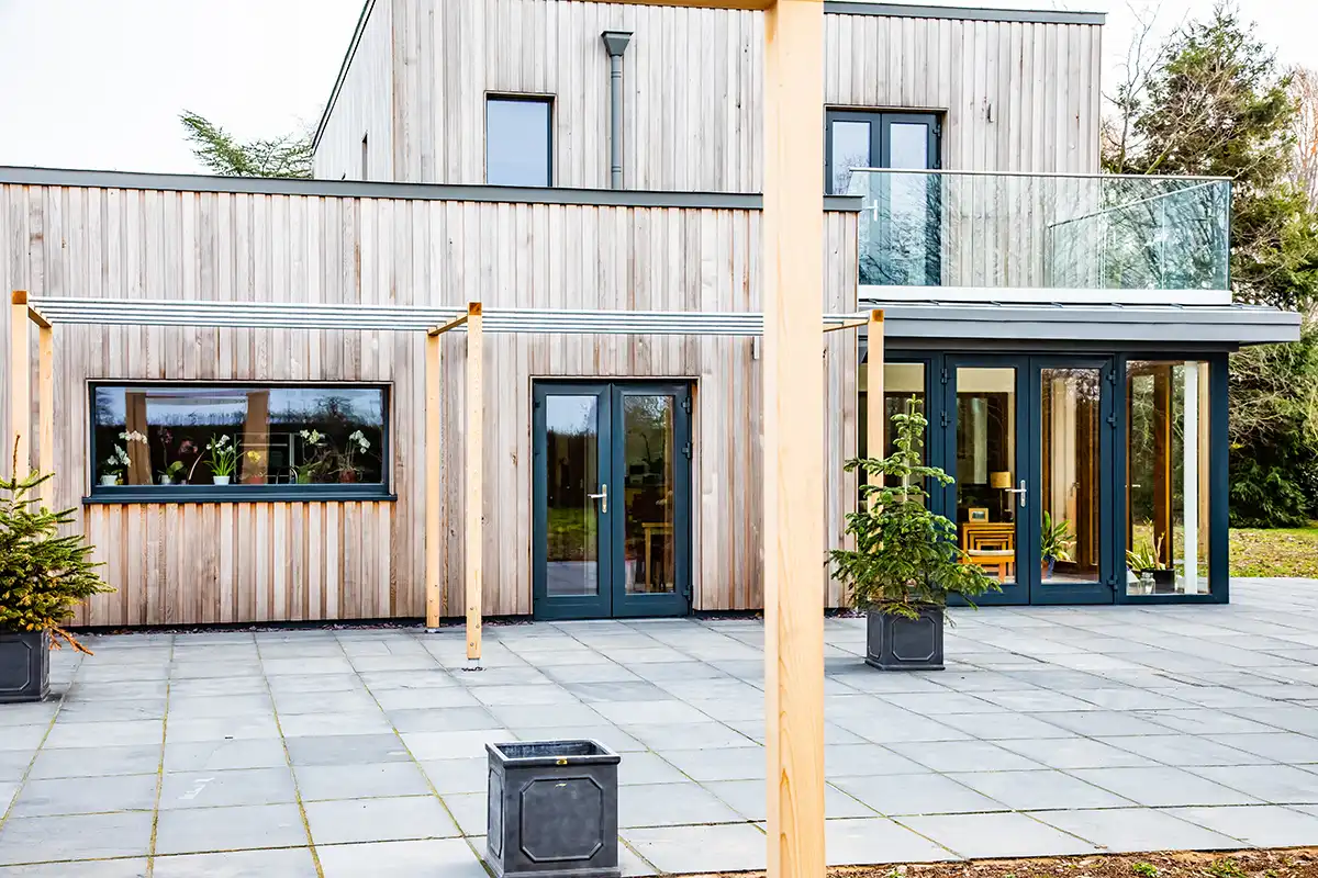 The anthracite grey external window colour combines beautifully with the larch cladding, and internally the medium-stained wood finish adds real warmth to the internal look. High performing 300-series windows were used throughout.