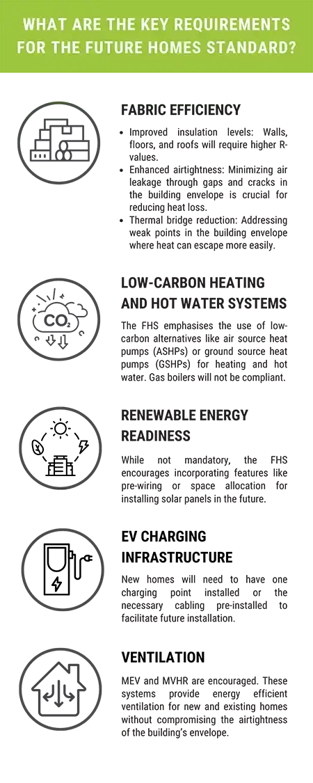Achieving "Zero-Carbon Ready" status: Homes built under the FHS will be designed and built with renewable or electric energy sources so that when the electricity grid becomes fully decarbonized, no further modifications will be necessary for the building to achieve zero carbon emissions. This means that gas boilers, including hybrid and hydrogen-ready versions, will not be compliant with this standard.