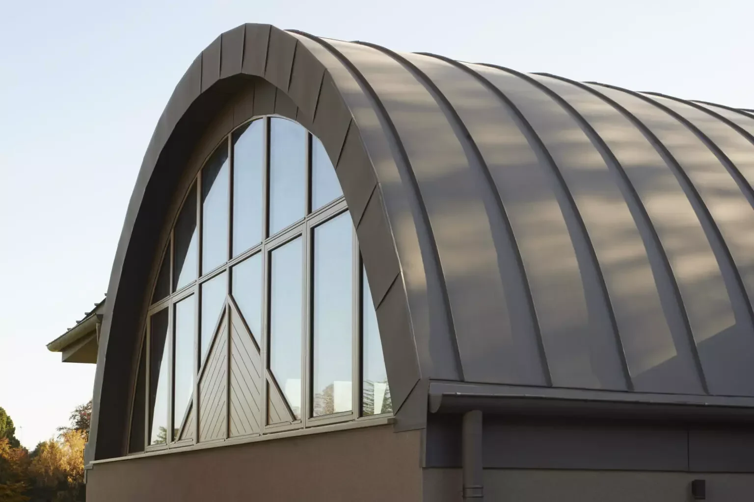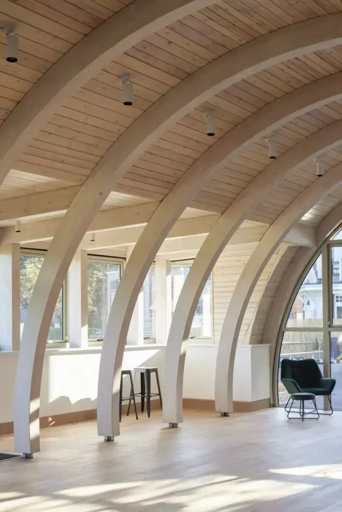 The design of the new curved roof honors the original semi-circular timber frame, maintaining the pavilion's historical character while incorporating modern enhancements - like glulam timber structural elements - to improve both structural integrity and environmental performance.