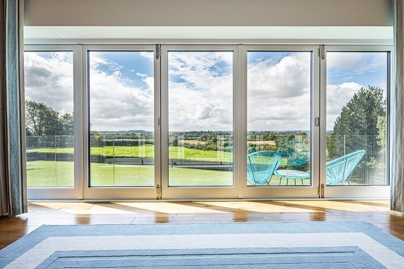sliding doors, bi-fold doors and large fixed screens allow natural daylight to flood the living areas, whilst the solar control glass maximises thermal efficiency and prevents overheating. The colour scheme of the products is clean and crisp, both internally and externally. Externally, the windows and doors are RAL9001 (Cream) and internally they are RAL9003 (Signal White).