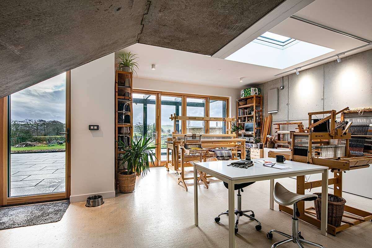 We love the way timber window frames pick up wood accents throughout the house - in the stairs, furniture, and even the weaving studio.